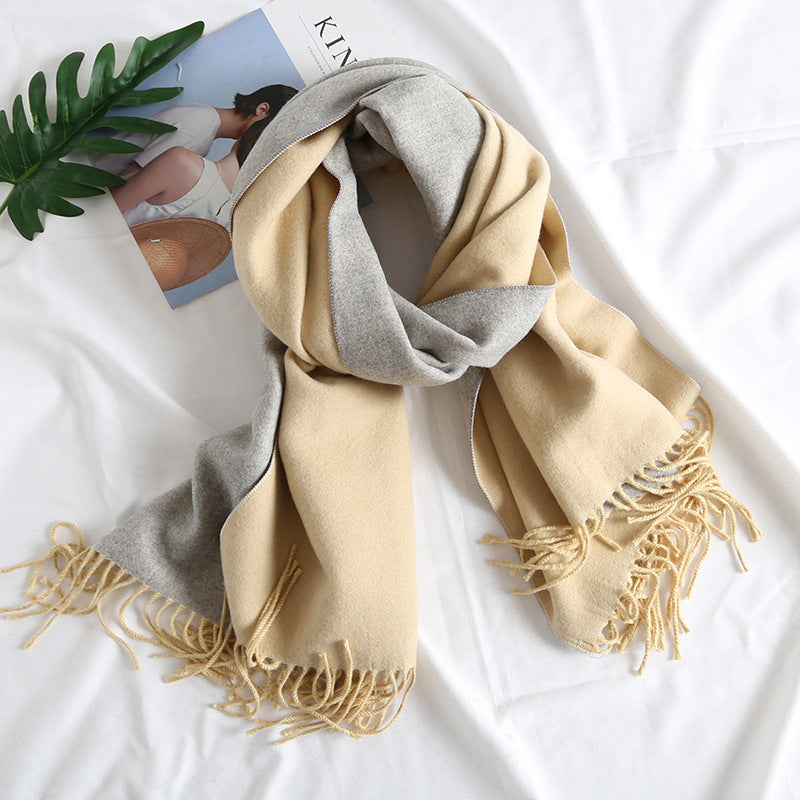 Featuring a double-sided two-tone design, each color combination—such as camel and beige, blue and gray, or wine red and gray—adds a stylish contrast that complements any outfit. Whether you’re dressing up for work, heading out for a casual stroll, or layering for a cozy evening, this scarf provides effortless charm and warmth.