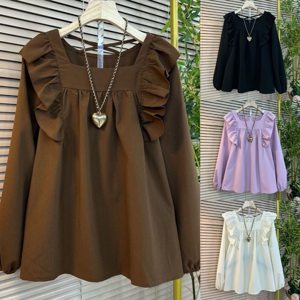 Plus Size Ruffled Square Collar Pullover Shirt for Women – Korean Style Long Sleeve Top (XL-6XL)